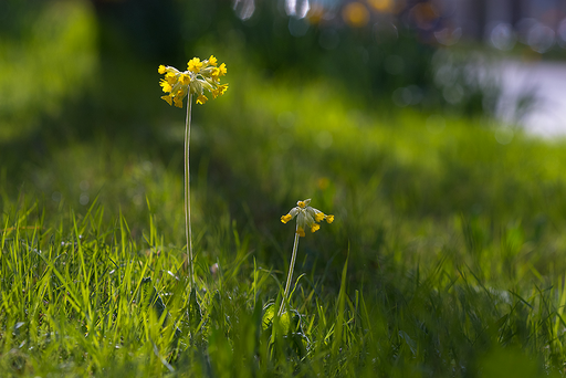 Een foto van twee bloeiende Gulden Sleutelbloemen. Op deze locatie, Den Haag vlakbij de grens met Loosduinen, tref ik deze mooie soort al drie voorjaars achtereen aan.